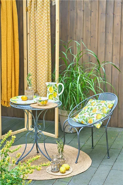 Stimmung auf Terrasse und Balkon. Sommerliche Zitronenmotive auf Teller und Kissen geben Ihrem