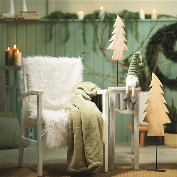 Mit der kuschelig grünen Decke wird die Weihnachtszeit so richtig warm und gemütlich. Der Farbton passt perfekt in die Trendwelt. Nach Weihnachten muss diese Decke nicht verbannt werden, der Frühling mit seinem frischen Grün folgt der kalten Jahreszeit. Der kleine Wichtel wird zum Stubenhocker. In den Farben Grün, Weiß und Grau ist er ein beliebter Mitbewohner, den man nicht mehr missen möchte. Der Baum aus Paulownia-Holz und dem schwarzen Standfuß ist ein modernes winterliches Dekoelement. Mit seinen unterschiedlichen Größen wirkt der Baum auf den Boden gestellt ebenso wie auf Tischen, Hockern oder Kommoden.