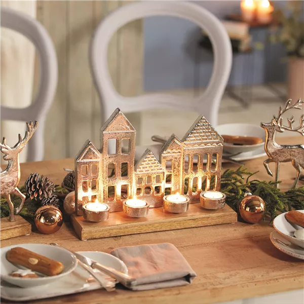 Die Häuserreihe mit Teelichthaltern erzeugt schöne Lichtspiele. Auf dem Esstisch oder einer Kommode platziert, mit weihnachtlichen Hirschfiguren ergänzt, erzeugt dieses ausgefallene Zusammenspiel eine besondere Stimmung.